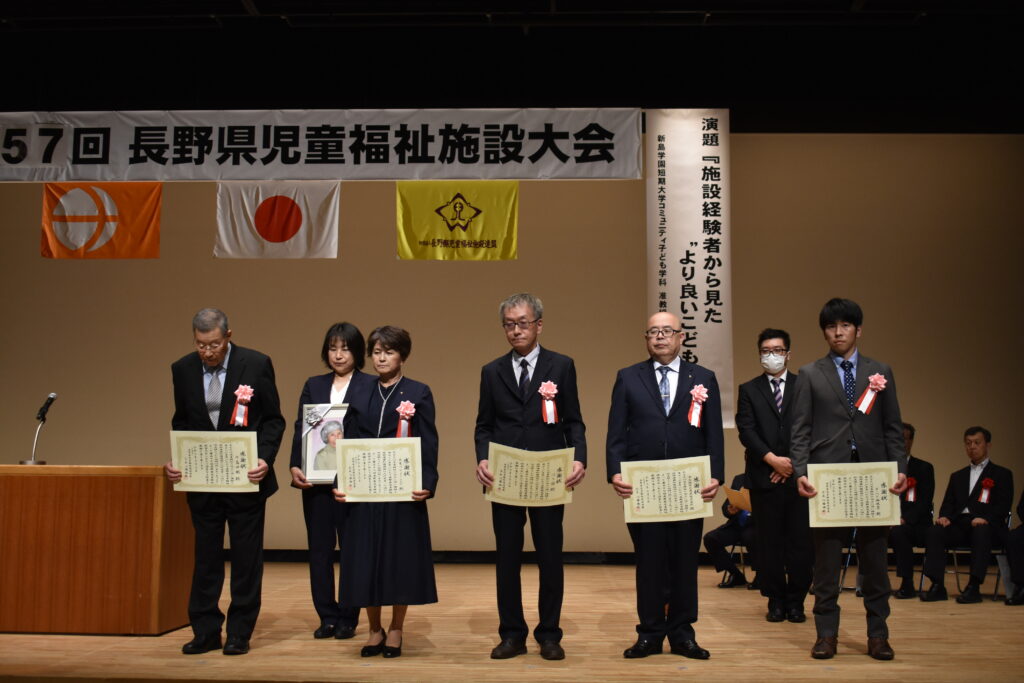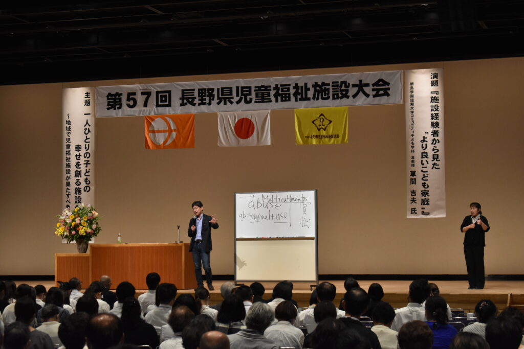 今大会は「一人ひとりの子どもの幸せを創る施設へ ~ 地域で児童福祉施設が果たすべき役割とは ~」を主題として挙げ、来賓に元厚生労働大臣・前経済再生大臣 現子ども政策全般の責任者で、こども・若者輝く未来創造 本部長の衆議院議員 後藤茂之様、長野県こども家庭課児童相談・養育支援室長様、松本市こども・福祉課長様、長野県社会福祉協議会常務様、長野県民生委員児童委員協議会連合会副会長様、長野県里親会連合会長様、松本市社会福祉協議会長様、長野県知的障がい福祉協会副会長様、県内市町村行政関係者、県内市町村民生委員児童委員協議会の皆様、県内の大学、短期大学の学生の皆様、児童福祉に関心がある一般の皆様、施設職員など、およそ340名の皆様が参集いただきました。 大会の式典では、連盟加盟施設の子どもたちへご支援をいただいている県内5団体(個人含む)の皆様へ会長より感謝状の贈呈をいたしました。式典後は、ご自身がケアリーバーでもある新島学園短期大学コミュニティ子ども学科准教授 草間 吉夫 氏による「施設経験者から見た“ よりよいこども家庭 ”」と題し、ご講演をいただきました。 ご参集いただきました皆様方には、長野県の社会的養護について熟考いただく時間となったことと思います。