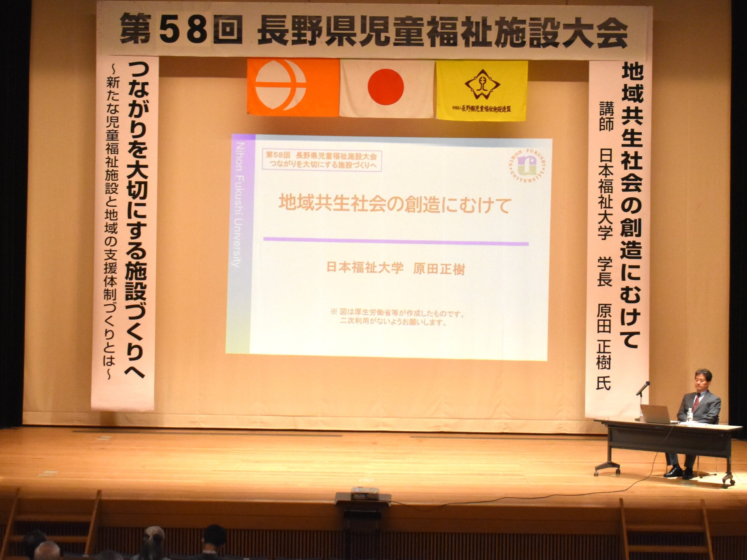 式典後は、日本福祉大学学長・副理事長 原田正樹 氏による「地域共生社会の創造にむけて」と題し、ご講演をいただきました。 ご参集いただきました皆様方には、長野県の社会的養護について熟考いただく時間となったことと思います。
